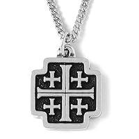 This handcrafted pendant measures .5 inch high by .5 inch wide and hangs from an 20-inch plated silver-tone cable chain. Constructed of sturdy pewter and rhodium-plated for maximum shine, this Jerusalem cross, also known as a crusader cross, is styled for either a man or a woman. It features a large cross in the center of the medallion with four smaller raised crosses in each of the four corners. This is a striking accessory to complement any casual attire.