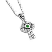 This traditional Celtic cross is patterned with knotwork and set with an Emerald-Green Glass Stone.Small to medium in size, an 18" box chain is included - both are crafted of solid sterling silver.