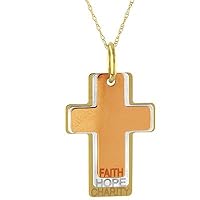 Express your faith in style with this lovely pendant. It is crafted with overlapping crosses made of 14k ruby, white and yellow gold with the words faith, hope and charity on the cross hanging from 18" rope chain.
